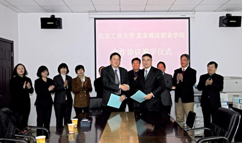 为加强校际合作,近日,我校与北京政法职业学院在一教110会议室签订合作框架协议。我校校长王晓纯、副校长罗学科、教务处处长张常年、文法学院院长郭涛、法律系主任吴邲光,北京政法职业学院党委书记张景荪、副院长陈勇以及各职能部门负责人出席了签约仪式。