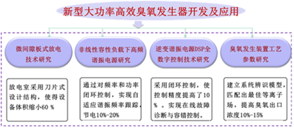 该项目以我校自主知识产权的新型大功率高效臭氧发生技术为支撑,以臭氧作为高强度氧化剂用于废水和废气深度处理,颠覆了传统用化学方法治污带来二次污染的严重问题,同比可以实现节能20%、体积缩小60%、控制精度提高10%等特点,部分关键技术达到国内领先水平。可以实现工业烟气脱硫、脱销、脱汞一体化治理和达标排放,也可以实现工业和生活污水的一次性综合治理和达标排放,特别是实现饮用水杀菌、消毒和除味的一次性综合处理。