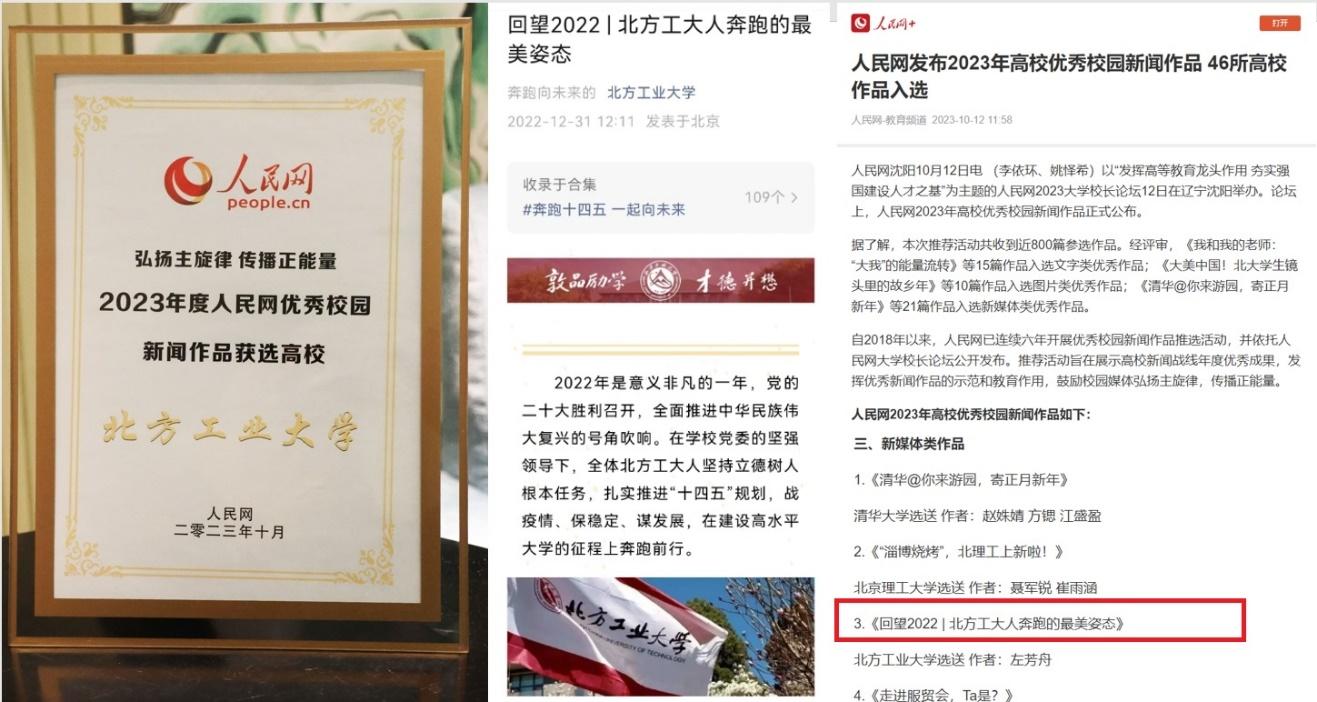 在10月13日举行的2023年大学校长论坛上,人民网现场公布了“2023年高校优秀校园新闻作品”,我校官微作品《回望2022|北方工大人奔跑的最美姿态》光荣入选。