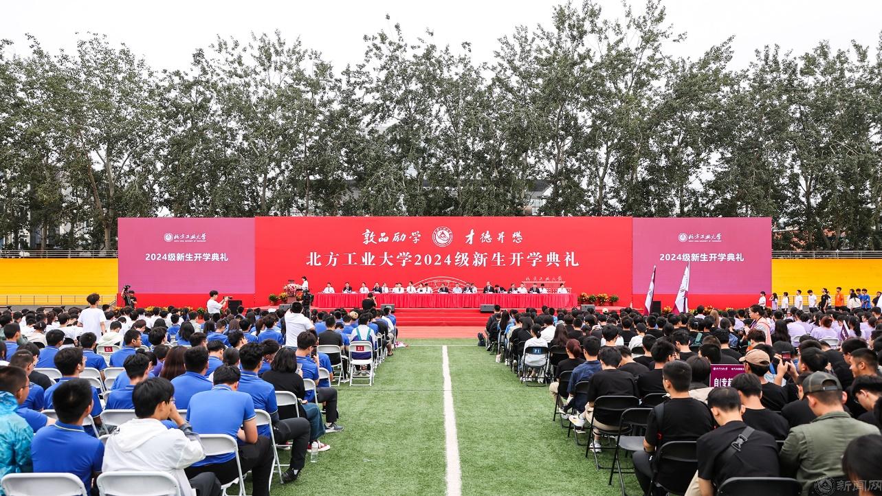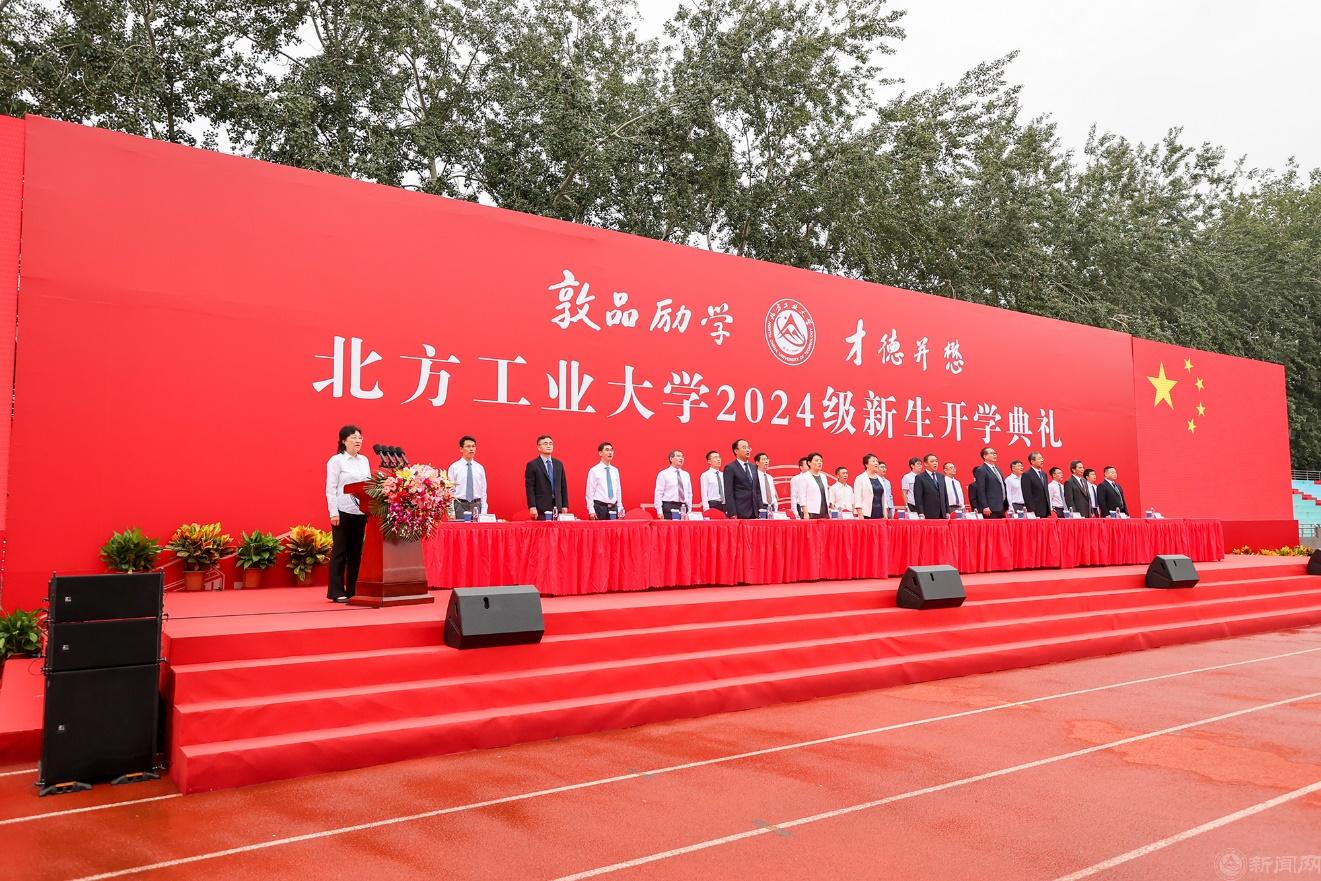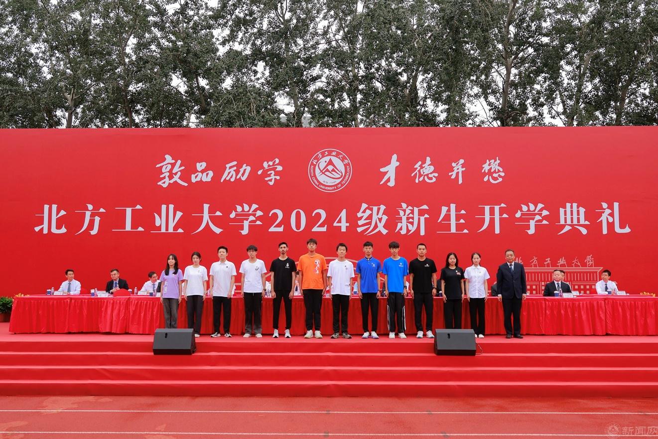 校党委书记刘军为新生代表佩戴校徽,欢迎2024级新同学缘聚北方工大大家庭,开启人生新征程。