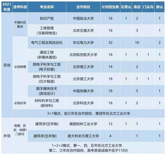 “外培计划”招生是由北京市市属高校与海外、境外知名高校共同培养优秀学生的一项举措。我校今年将招收16名北京籍学生,按 “1+2+2”模式培养,即:第1年在本校学习基础知识、强化外语能力,中间2年到境外大学就读访学,剩余2年回到本校完成学业。