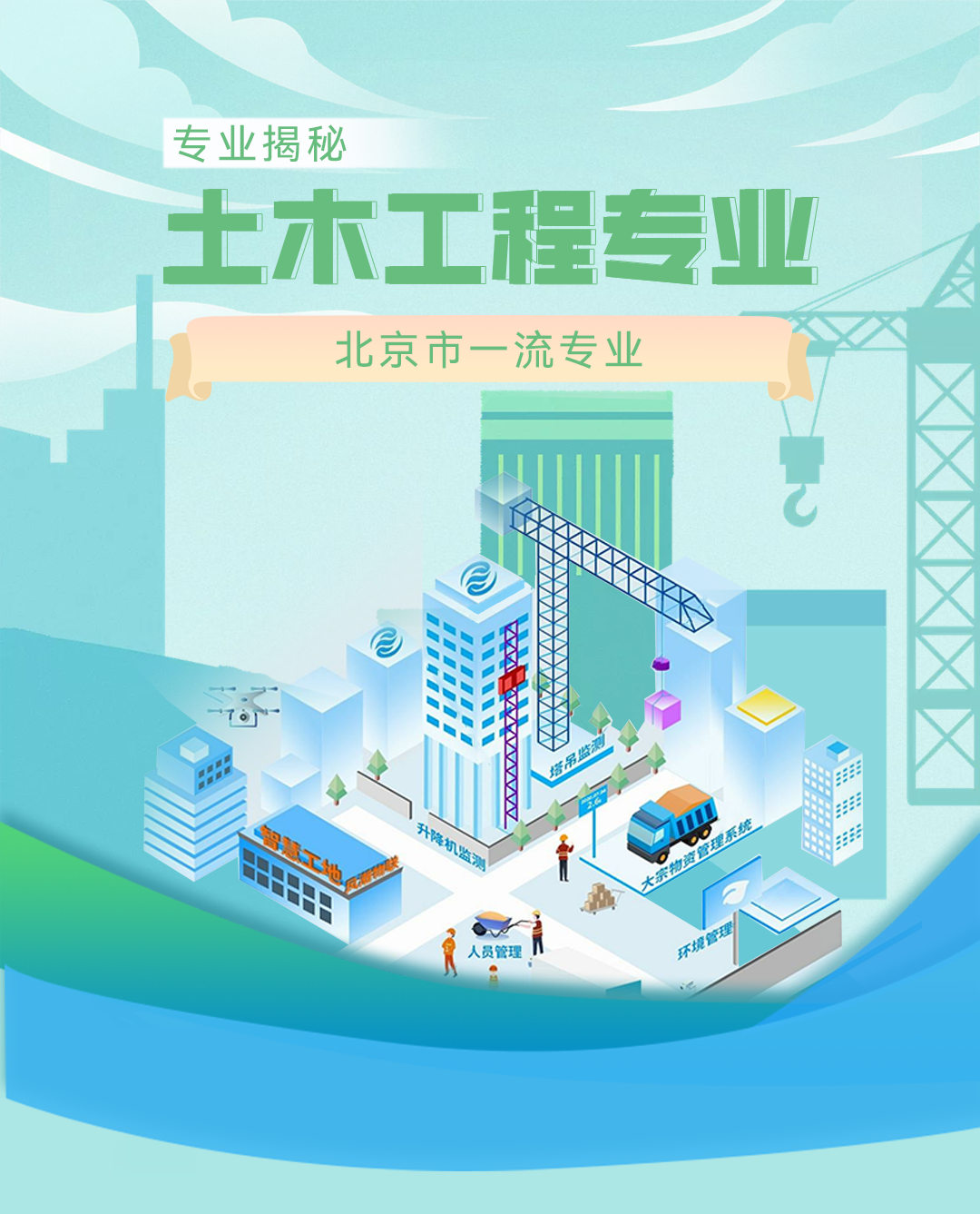 随着我国经济与科学技术的飞速发展和城市化进程的持续深入,各项重大土木工程将陆续兴建,未来土木工程的发展趋势是工程规模向大型化、立体化方向发展,规划设计向科学化、自动化方向发展,工程材料向多功能、智能化方向发展,施工建造向信息化、工厂化发展,将为土木工程专业毕业生提供大量就业岗位。同时,国家“一带一路”倡议的实施以及“八横八纵”规划等大量国际国内重大工程项目的陆续上马,为土木工程专业毕业生提供了更为广阔的就业前景。