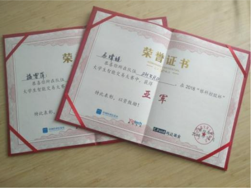 2018年首届全国“银科控股杯”智能交易大赛中,本专业团队仅次于当年的冠军队南京大学,获全国亚军,并获取奖金5万元人民币及20%的实盘收益(实盘本金50万人民币)。